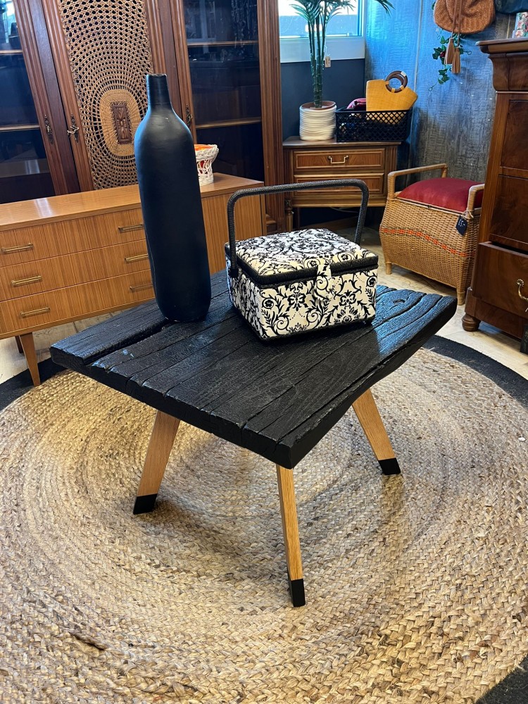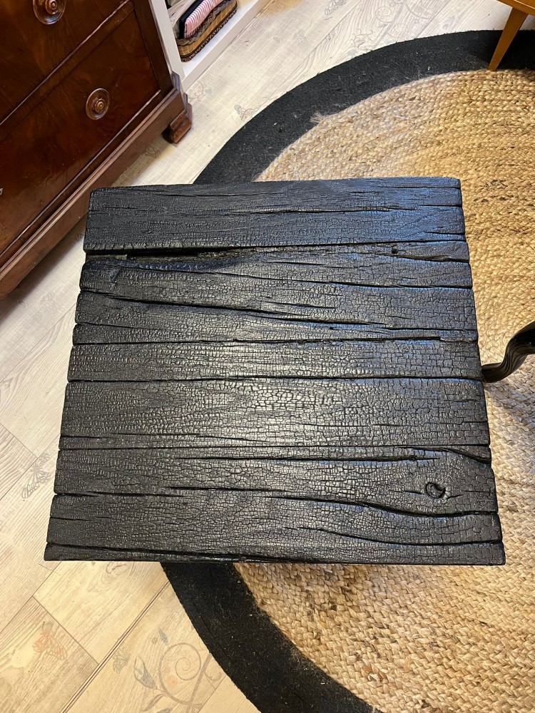 Table d'appoint en bois brulée, peinte en noir. Pieds centraux en bois clair, extrémités noirs.