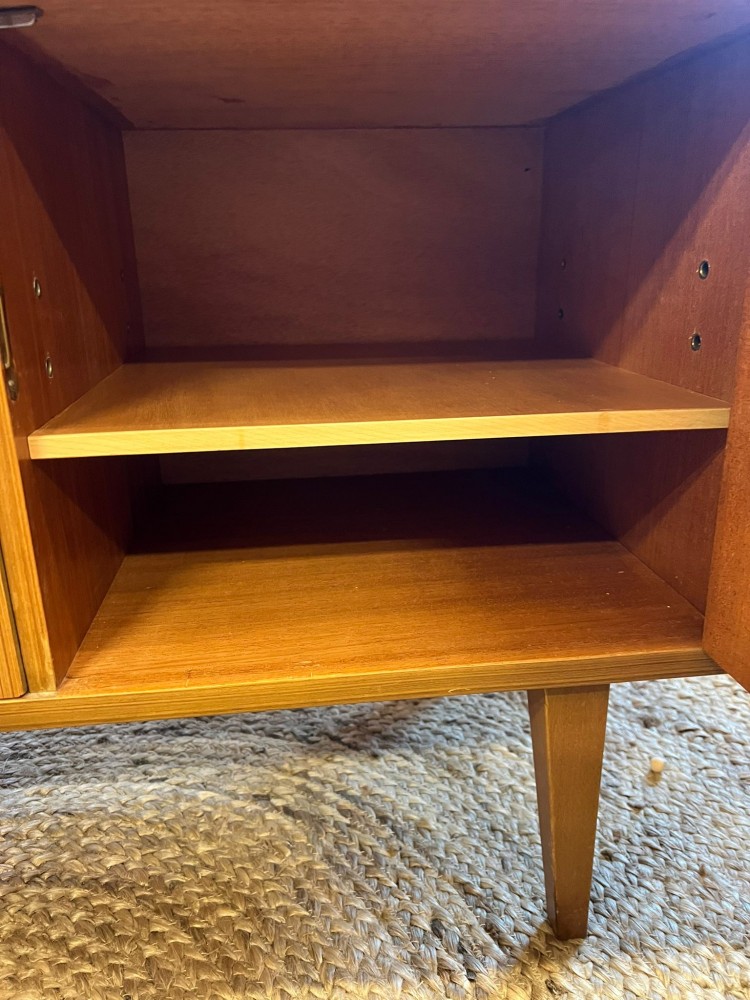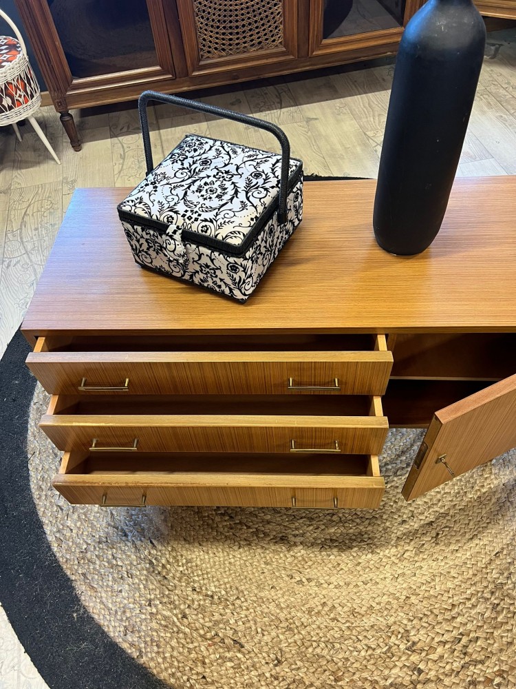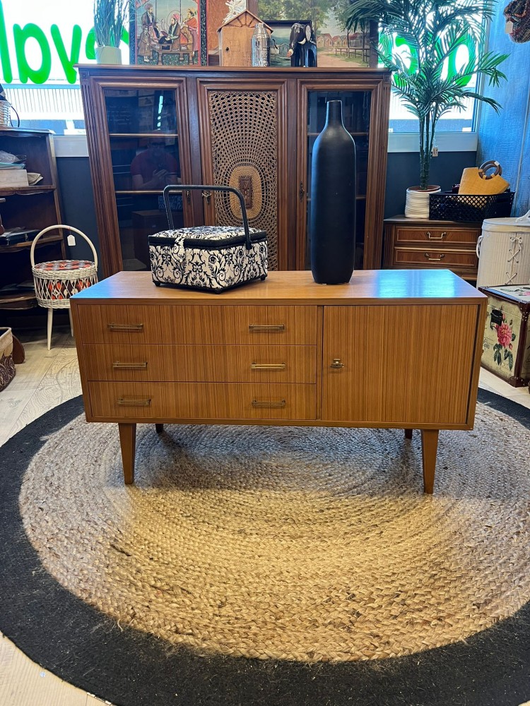 Commode vintage, placage en teck verni, pieds et poignées en laiton.