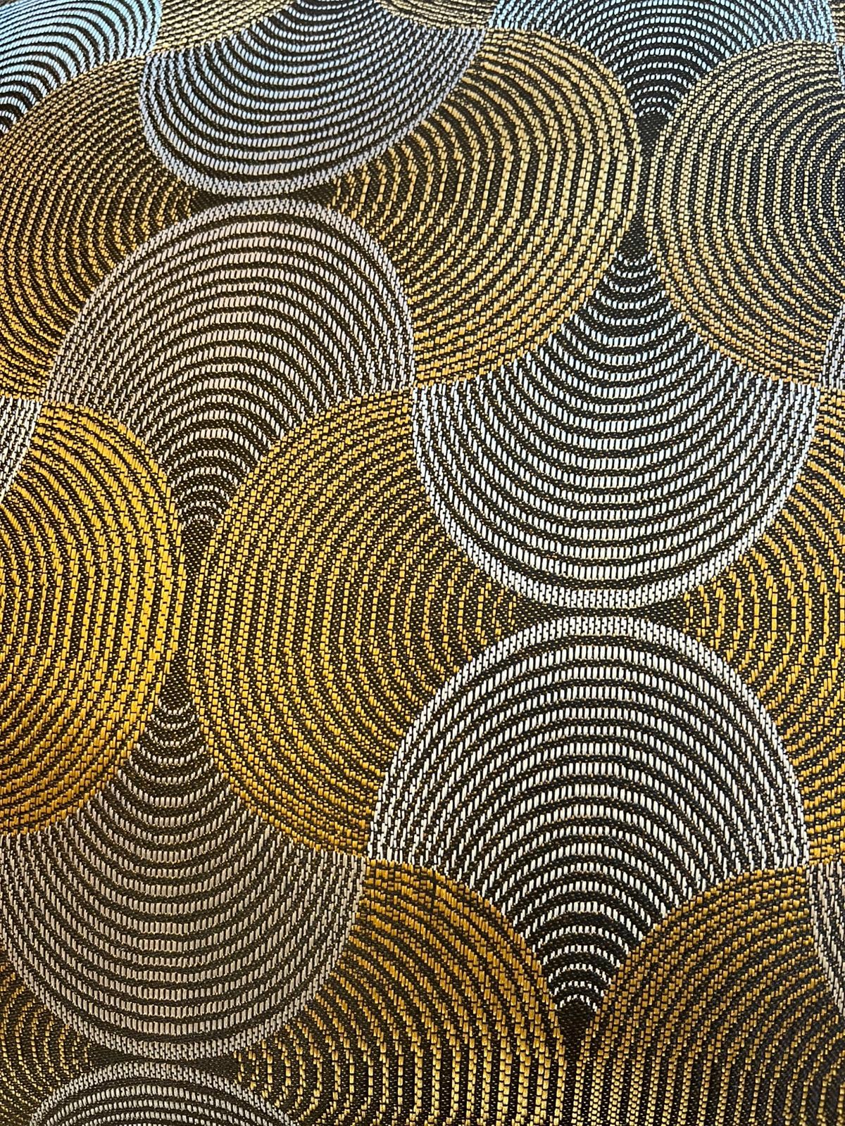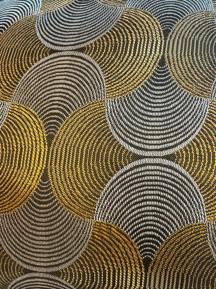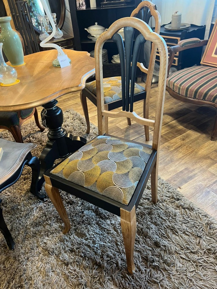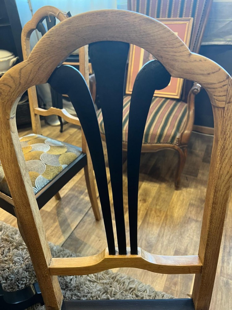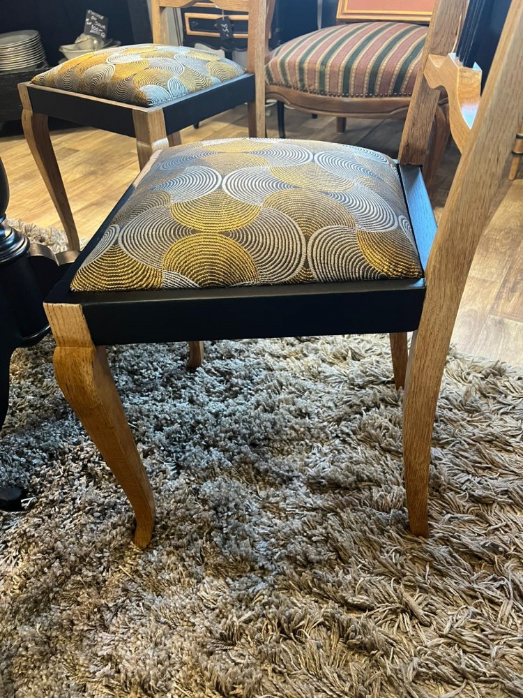 Chaise art déco en bois clair, assise et dossier peint en noir. Assise tapissée d'un motif Jaquard.