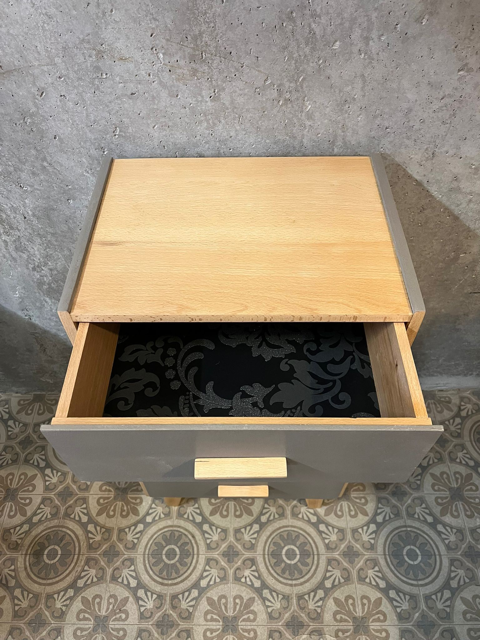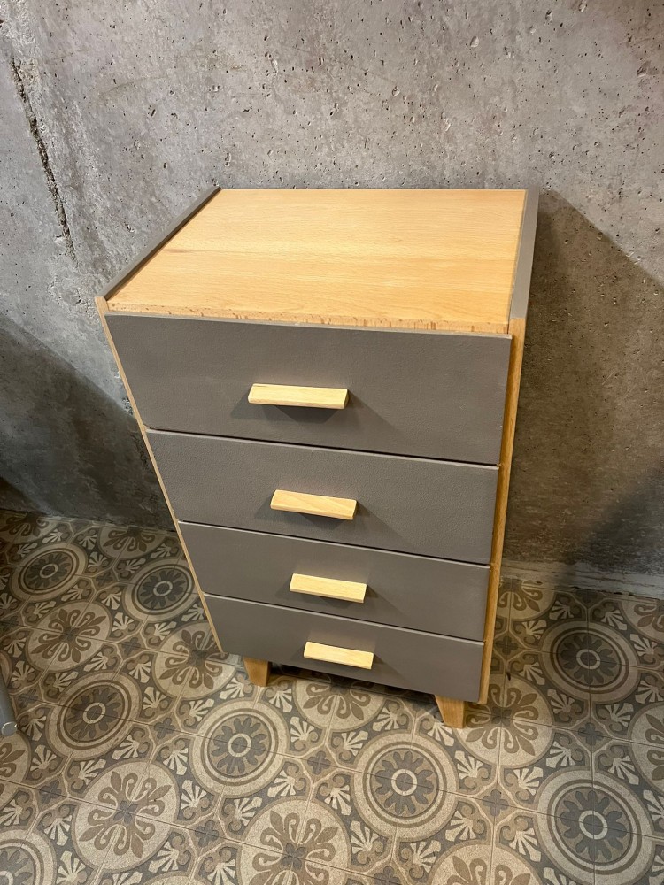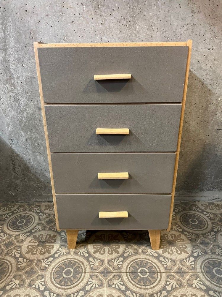 Petite commode en bois naturel, peinte en gris. Quatre tiroirs tapissés d'un papier peint à motifs végétaux.