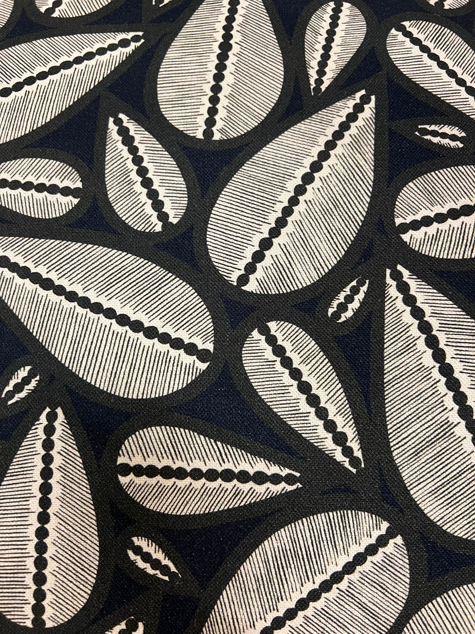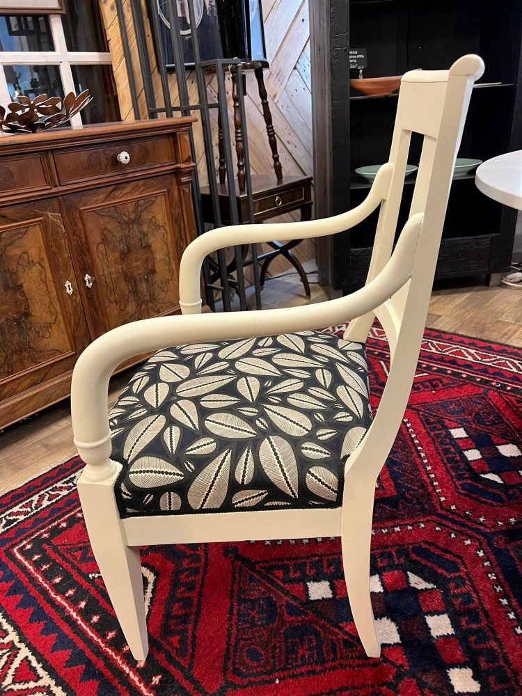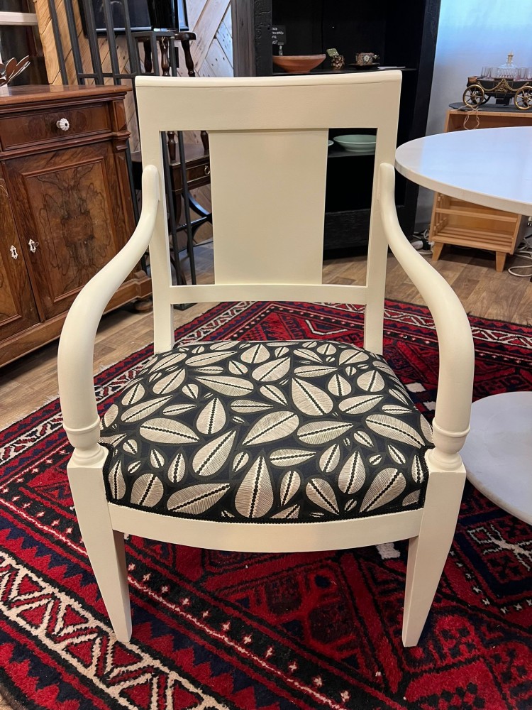 Fauteuil Voltaire relooké dans nos ateliers, peint en blanc, recouvert d'un tissu à motifs grains de café.