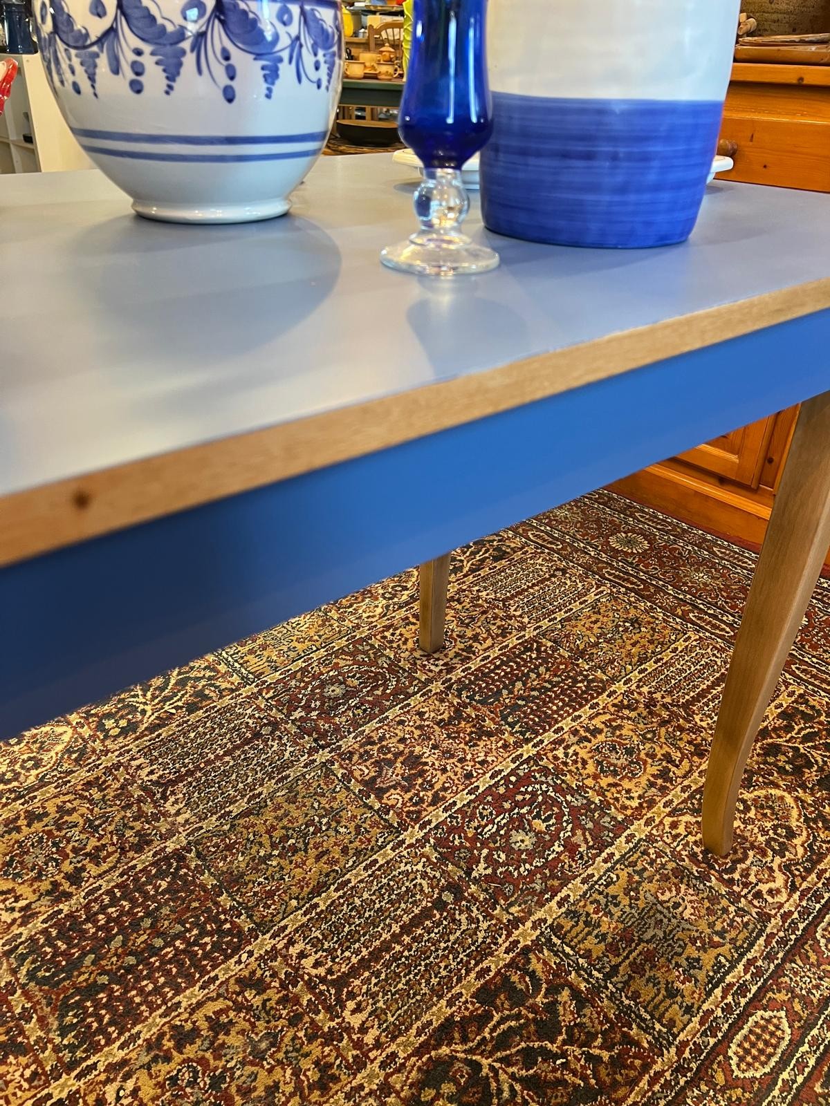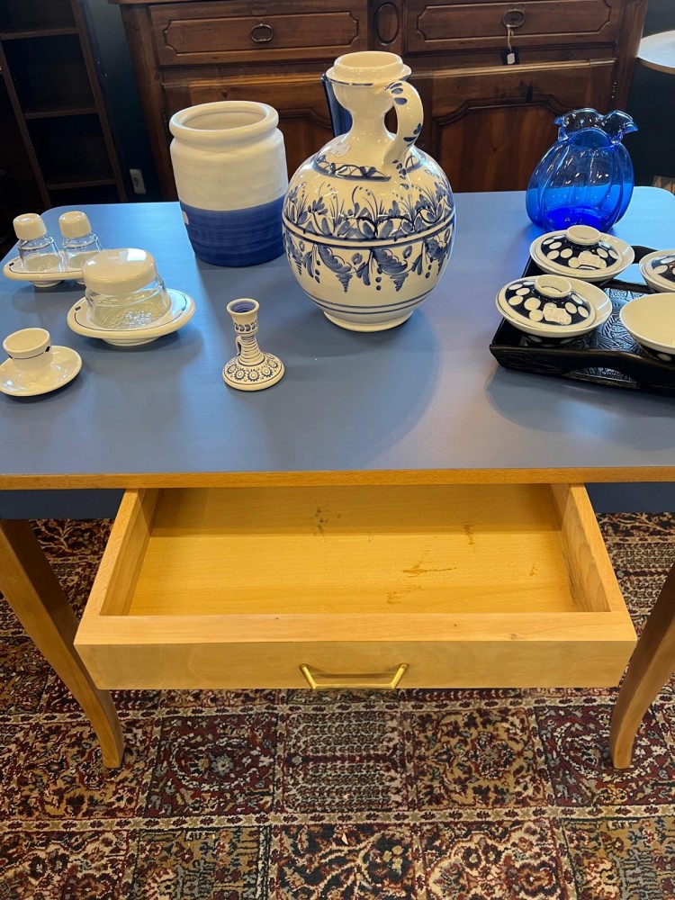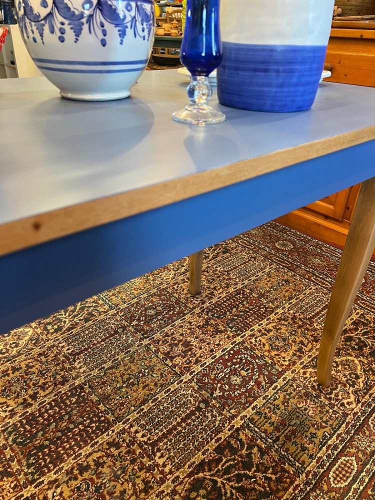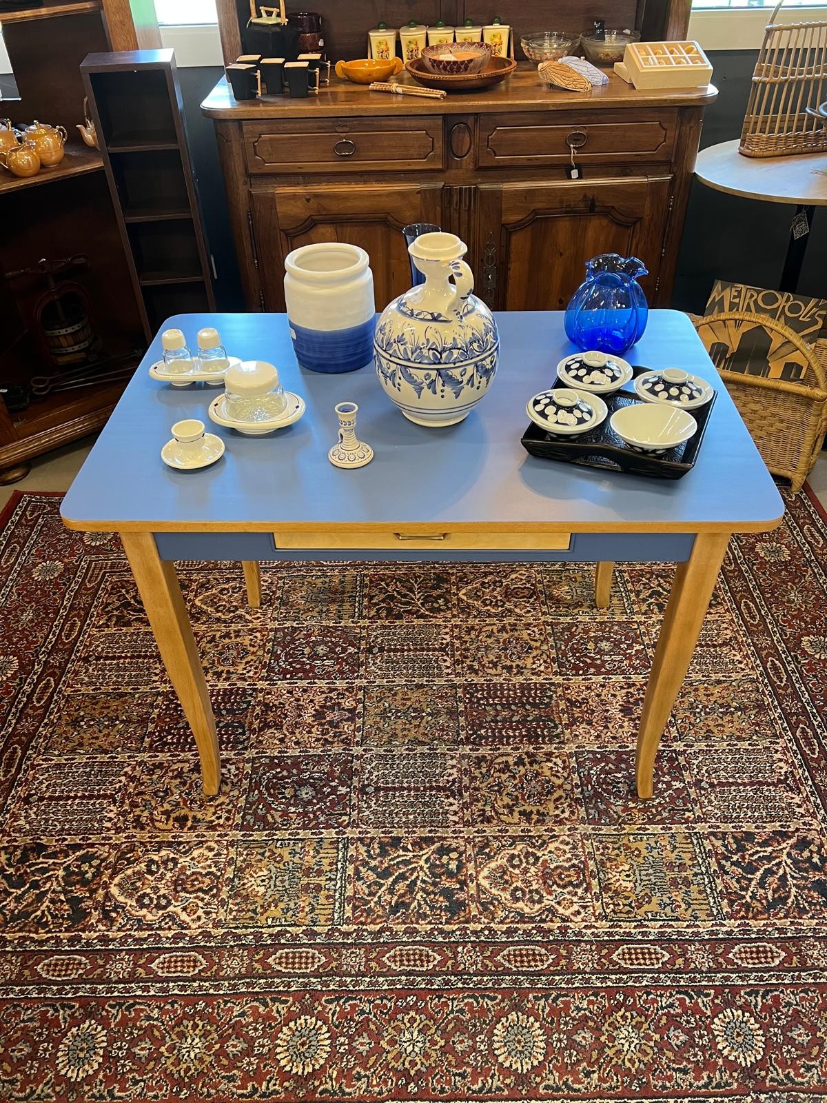Table ancienne relookée dans nos ateliers. Bois naturel et peinture bleu claire, tiroir central.