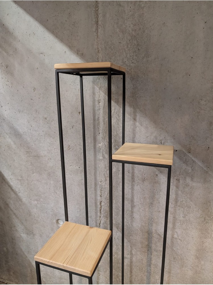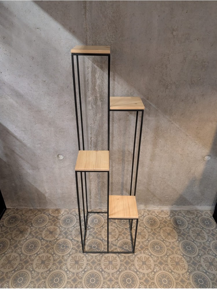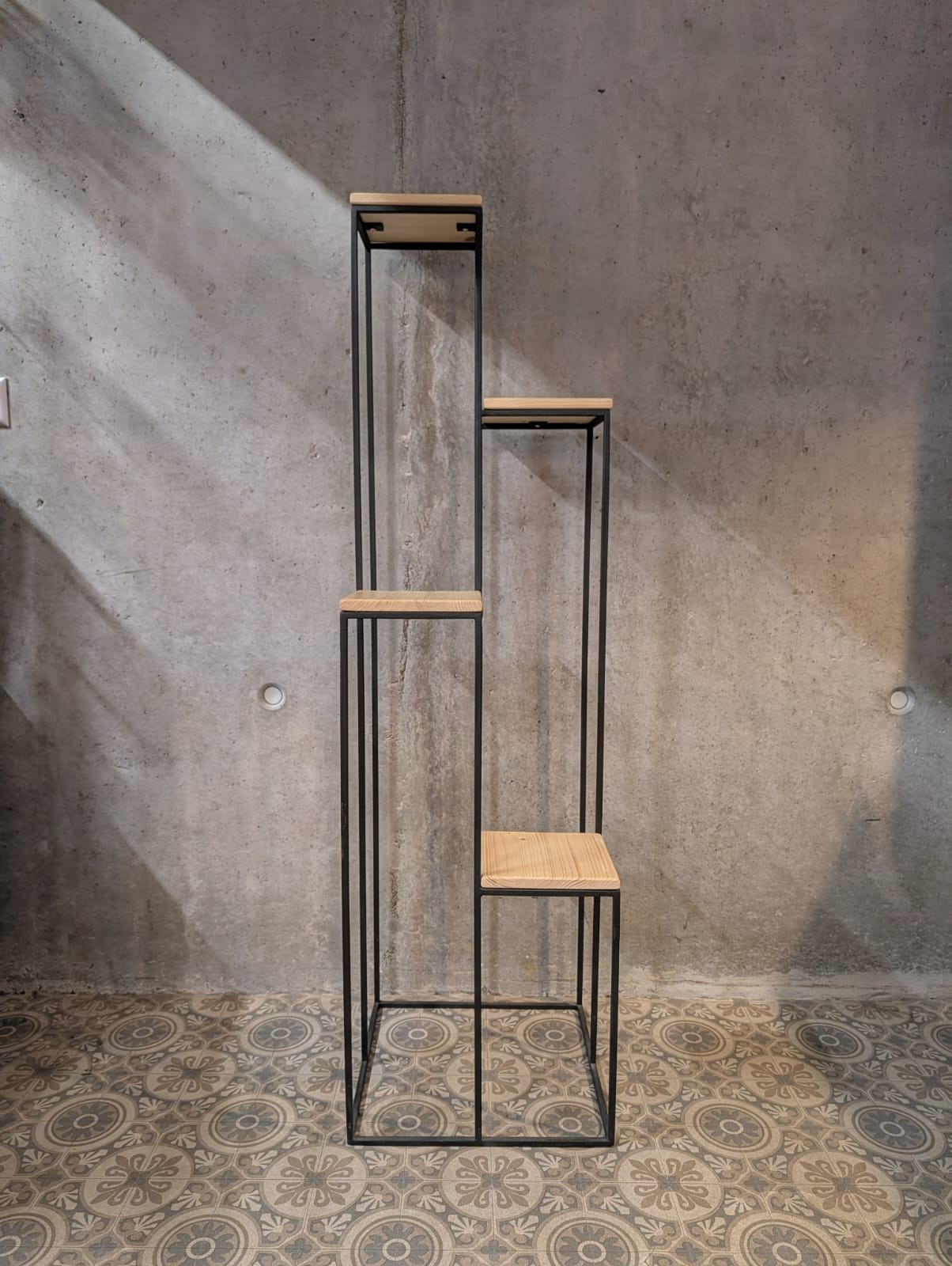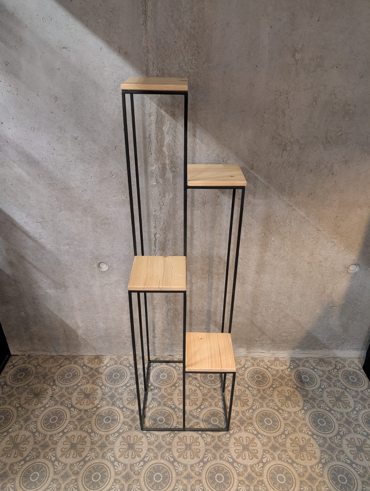 Porte-plante en acier peint en noir, plateau en bois clair.