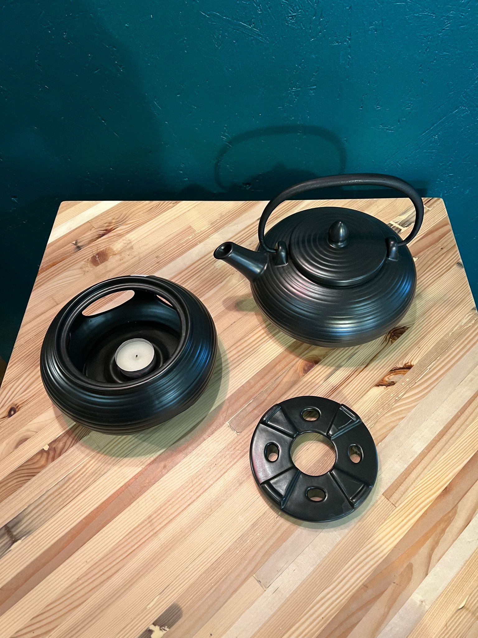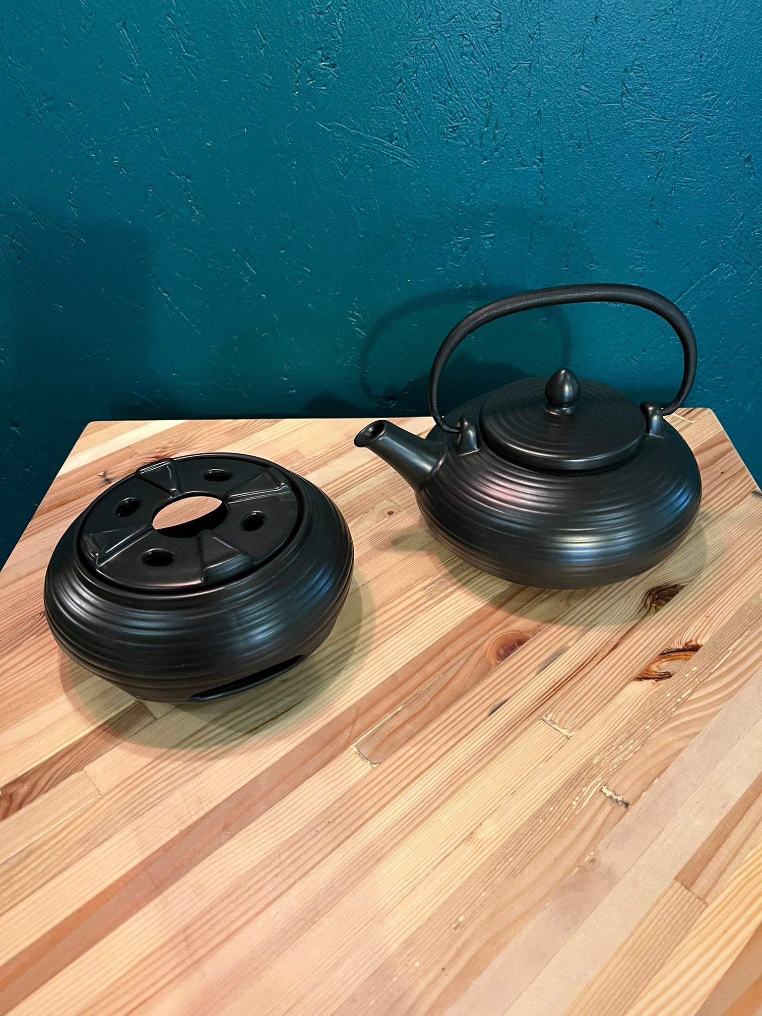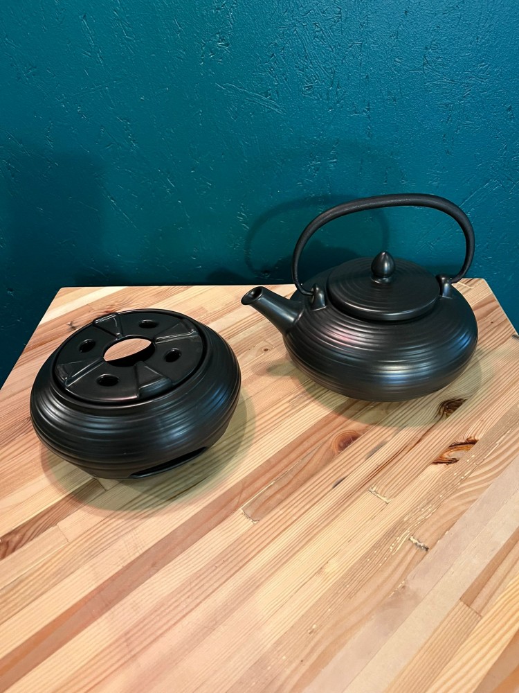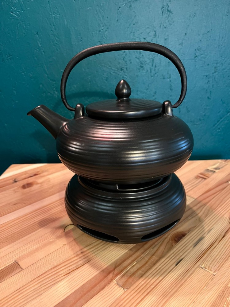 Théière en fonte lisse noir ainsi que son réchaud, inspiration japonaise.