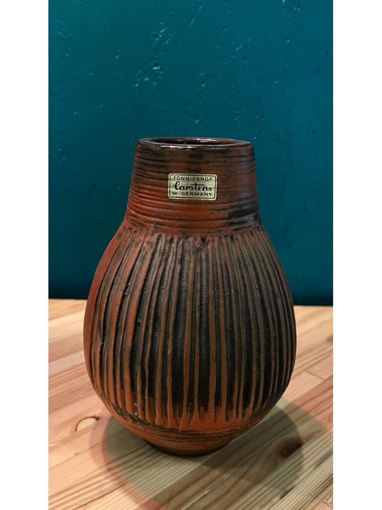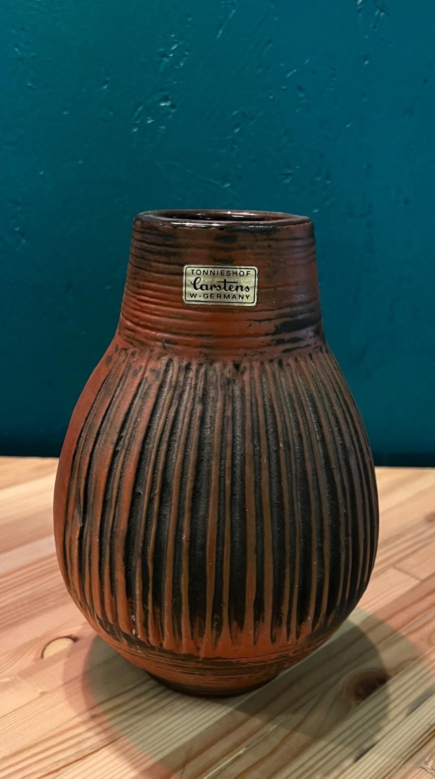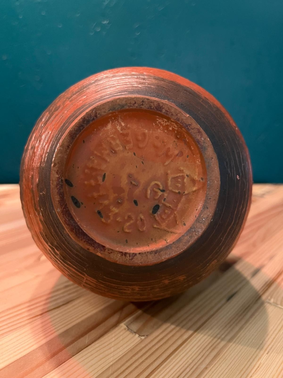 Vase style brutaliste en argile, tons orange brûlé et noir. Légère ébréchure.