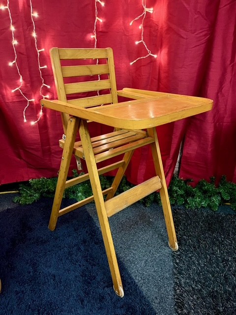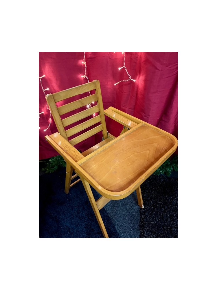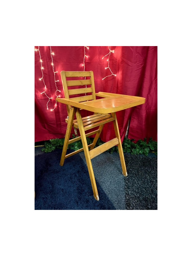Chaise haute en bois clair pour enfant.