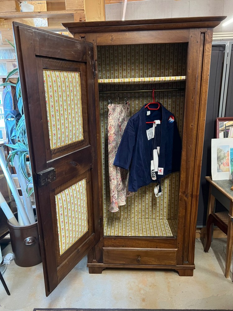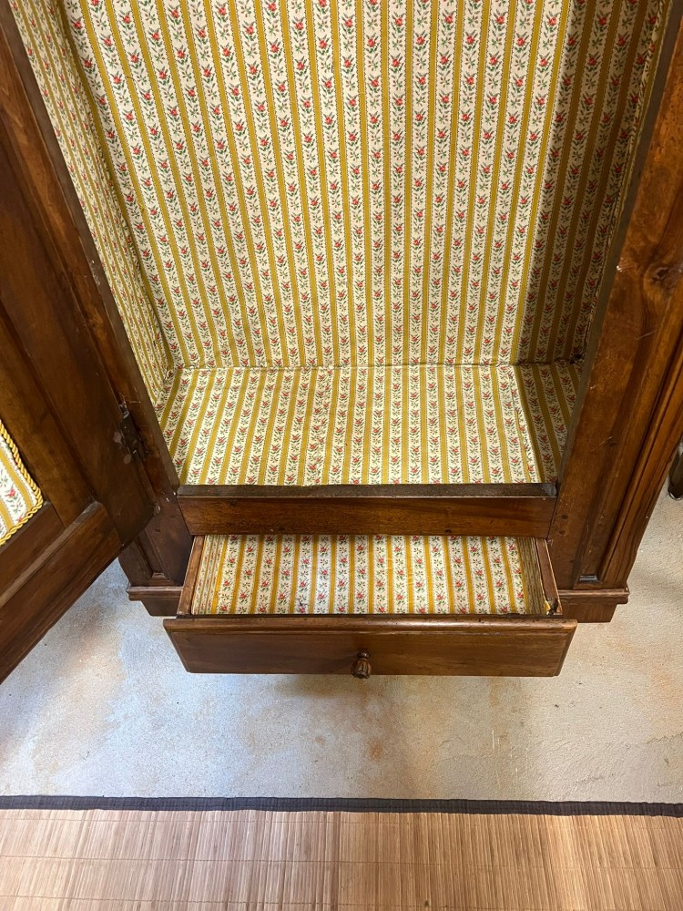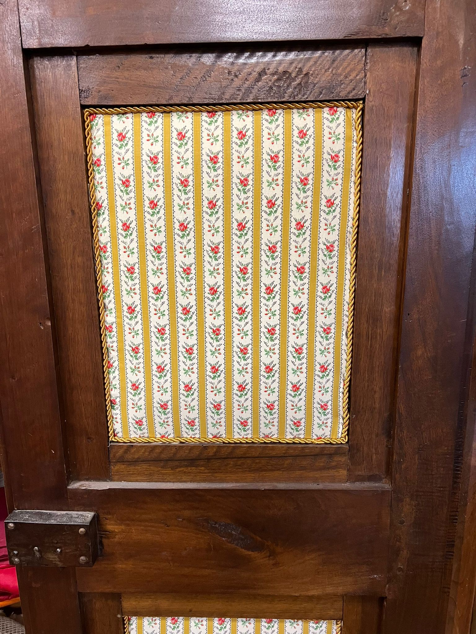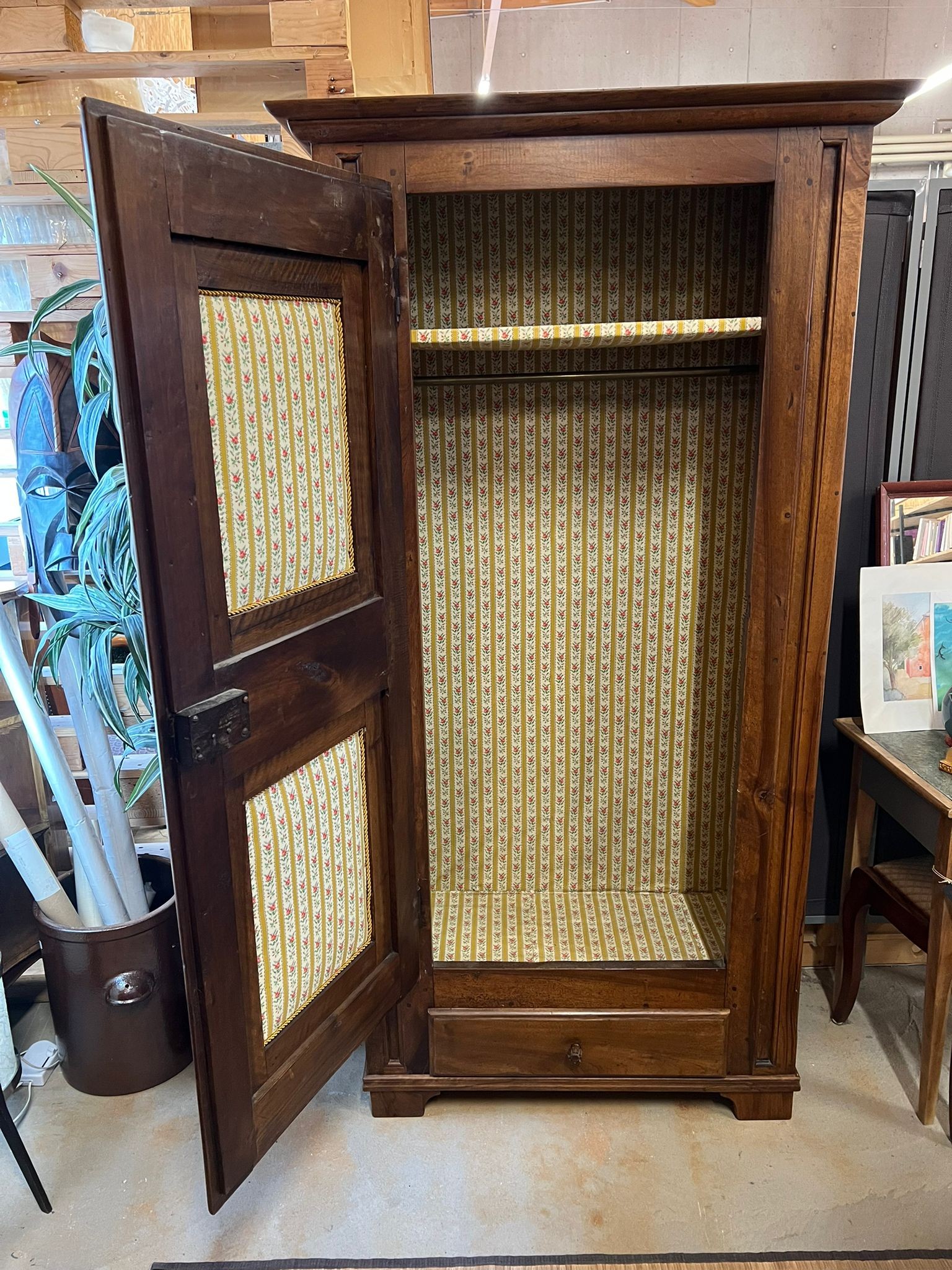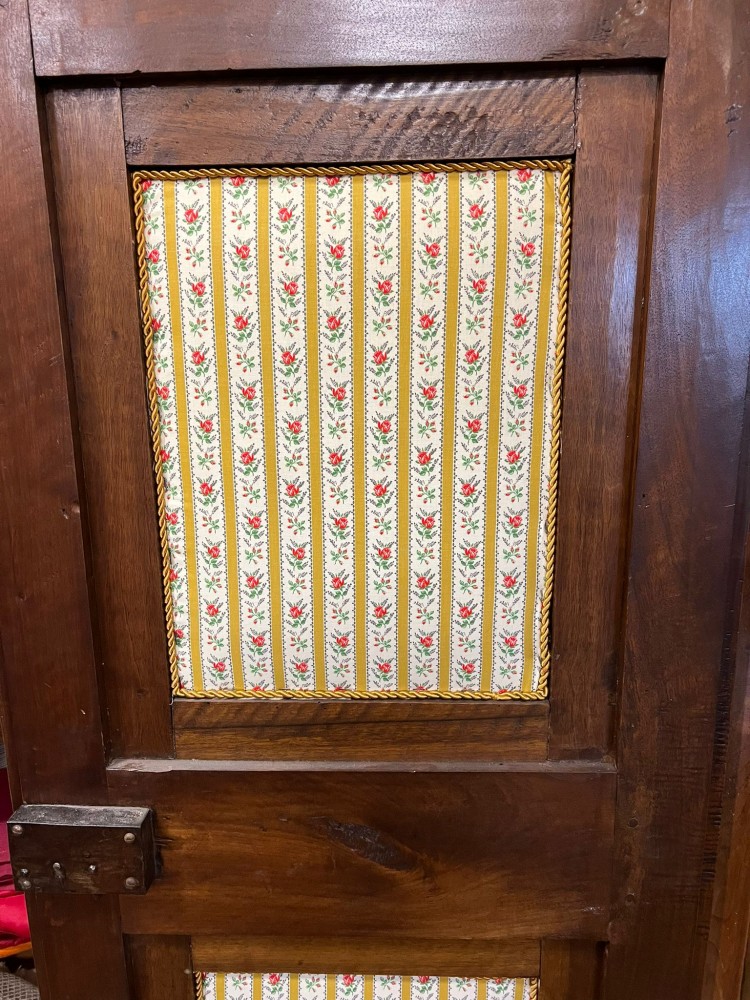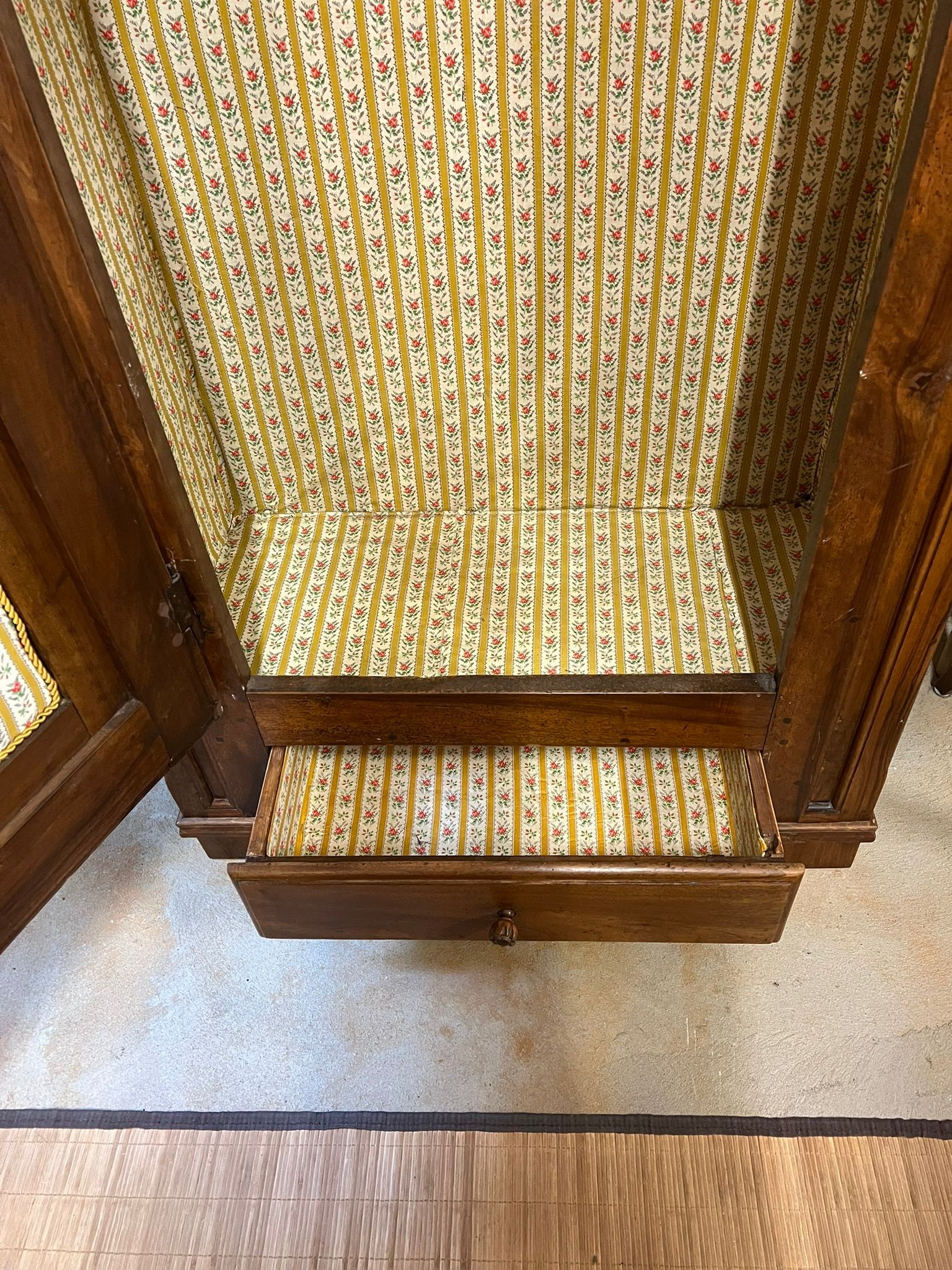 Armoire vaudoise, style rustique. Fond et intérieur de porte tapissé d'un motif rayé vintage.