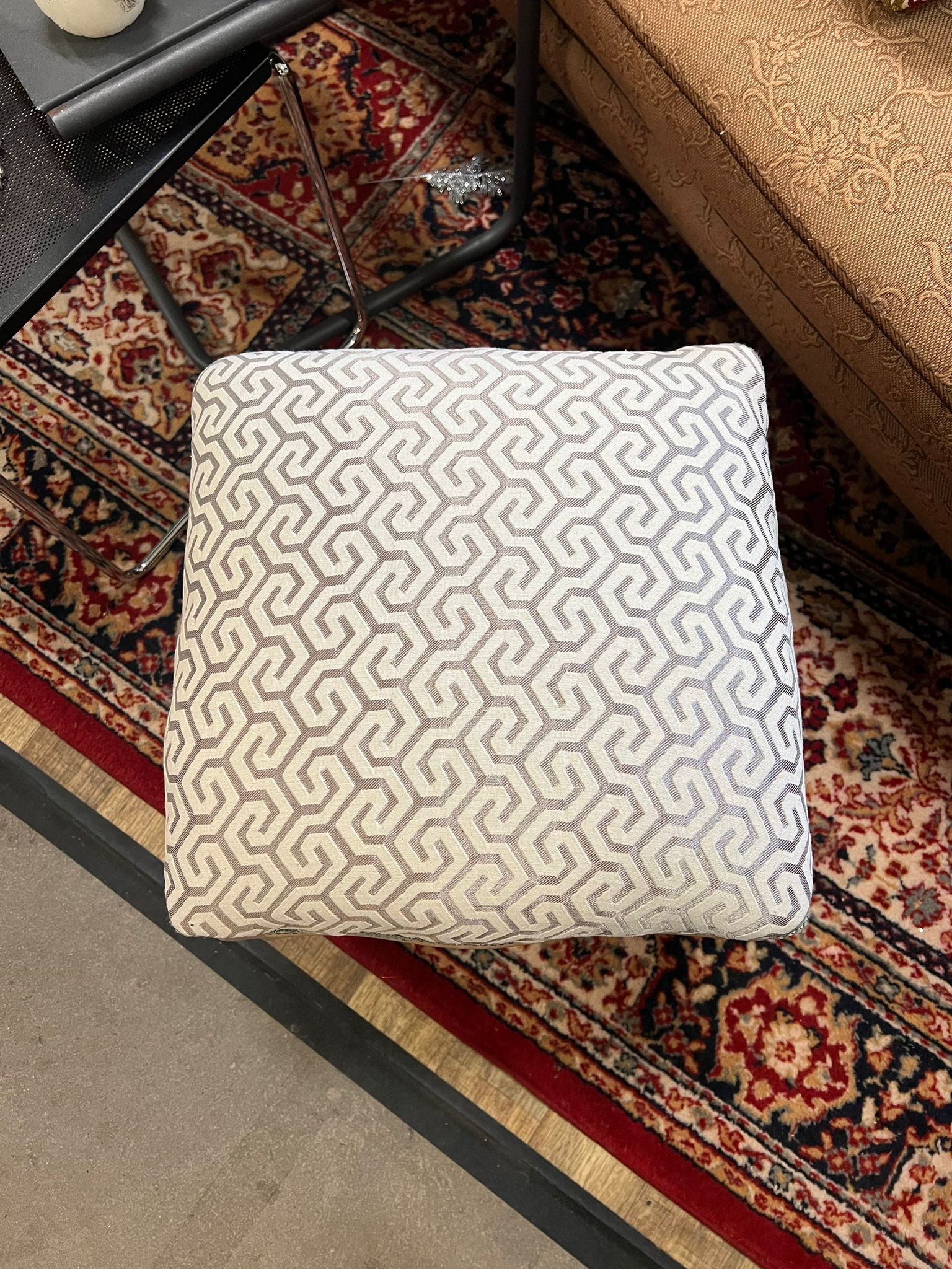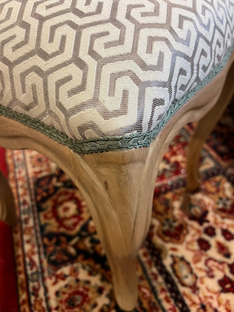 Tabouret style Louis XV en bois clair. Revêtement tapissé d'un motif géométrique et galons gris.