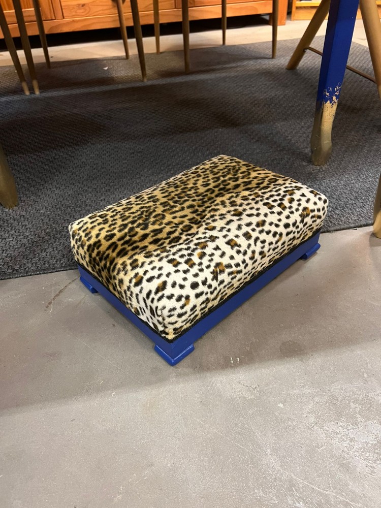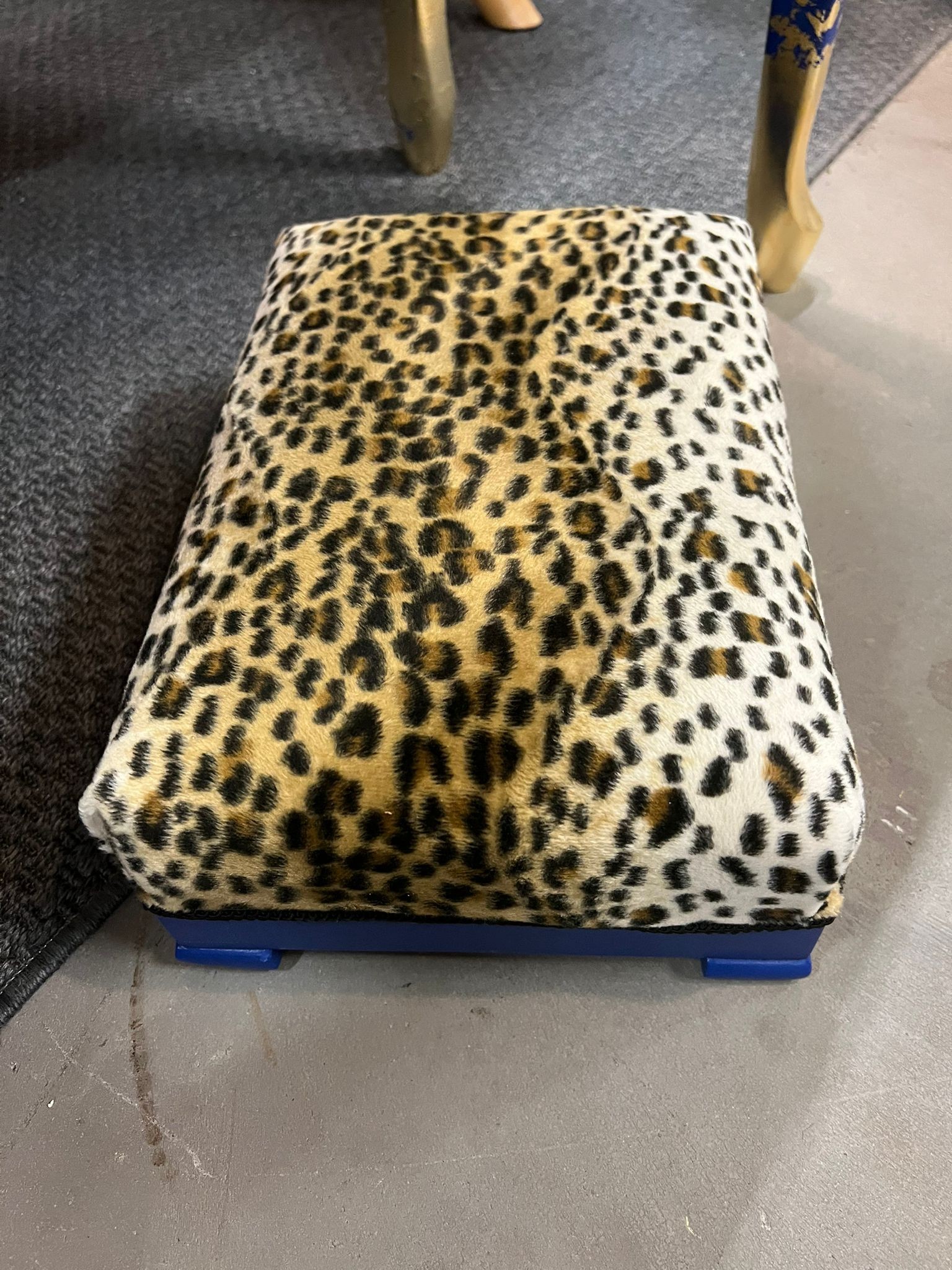 Repose-pied peint en bleu roi, appui tapissé d'un motif léopard et galon noir.