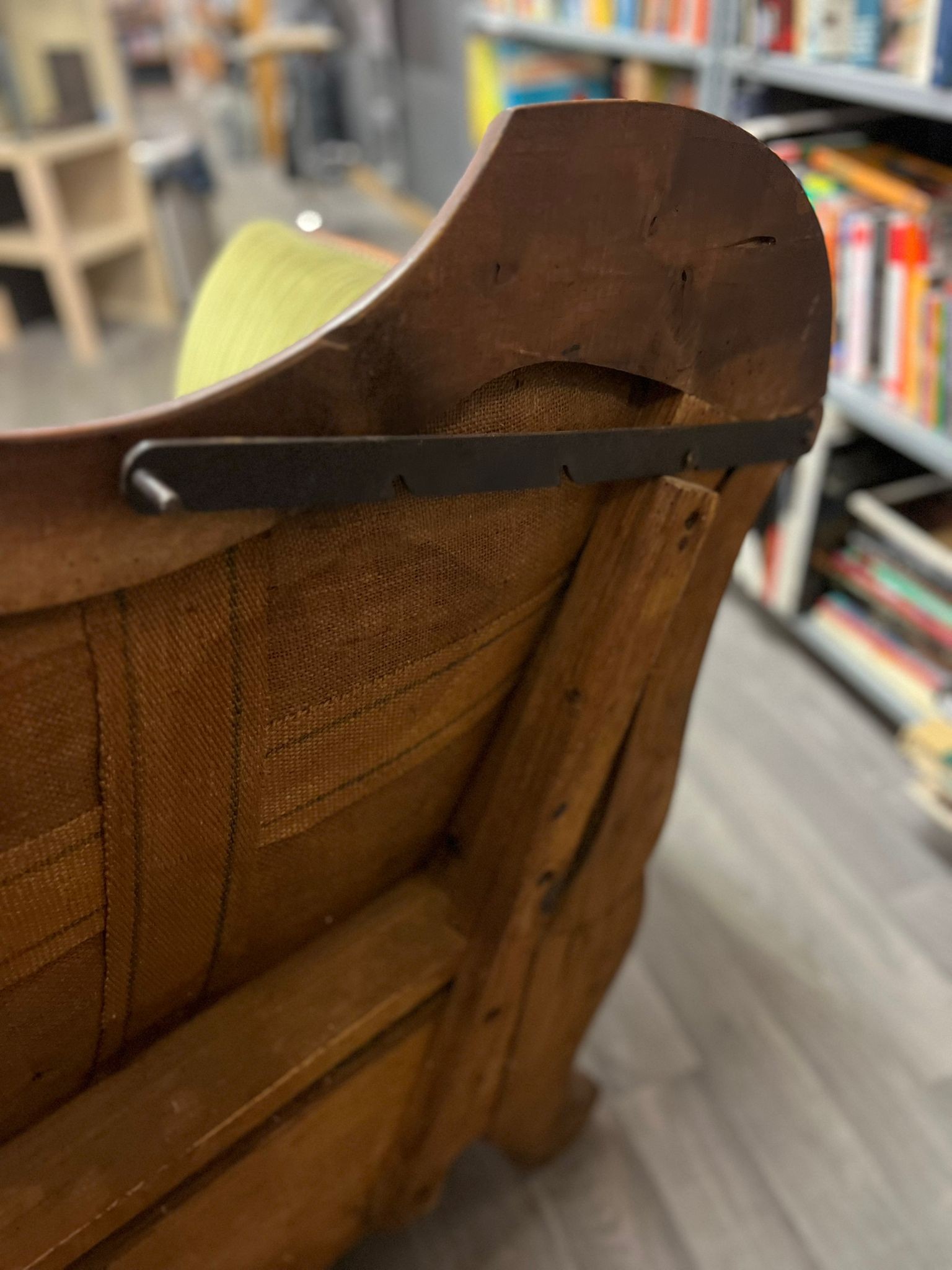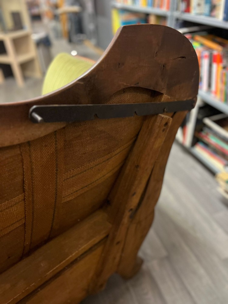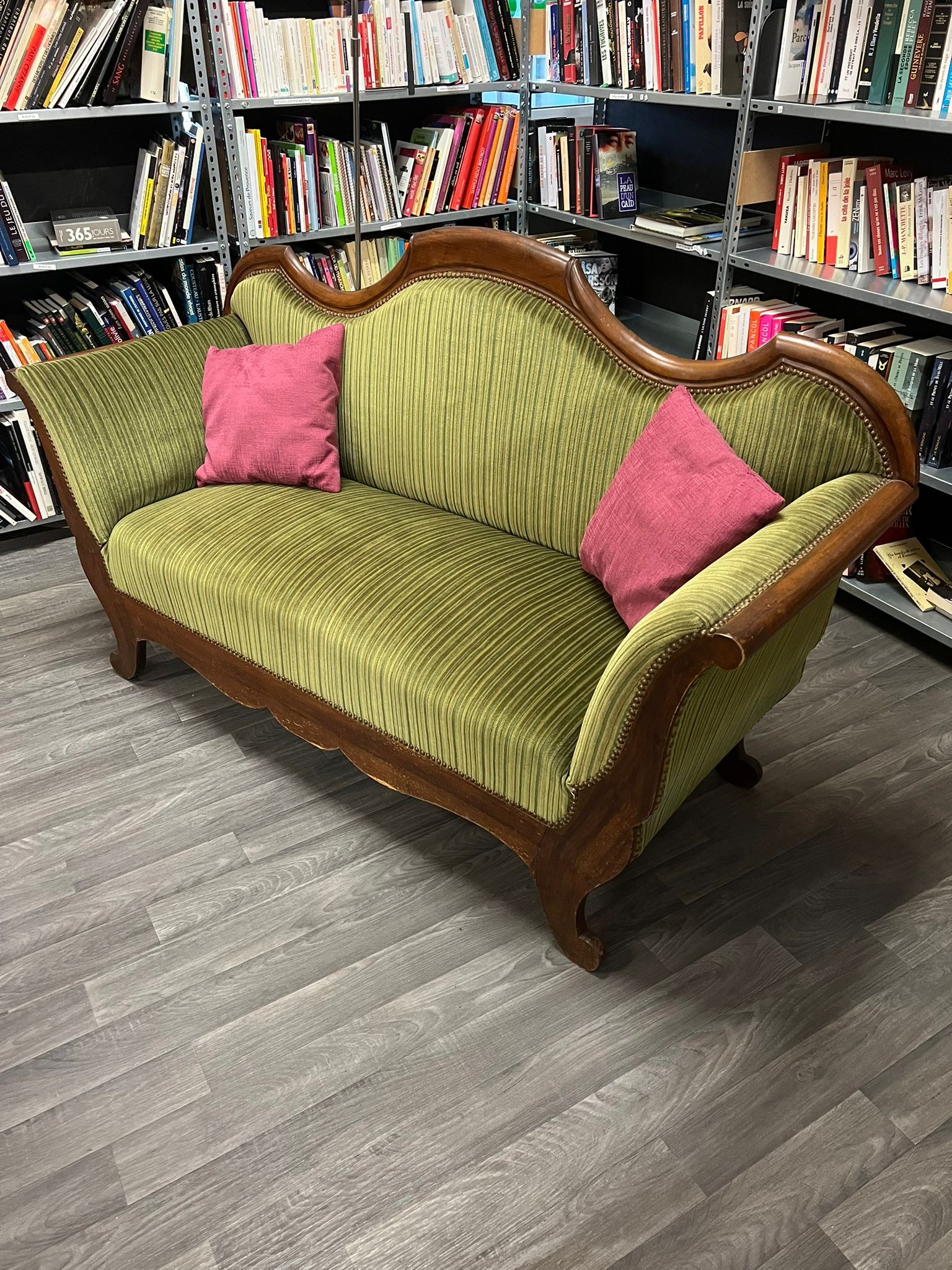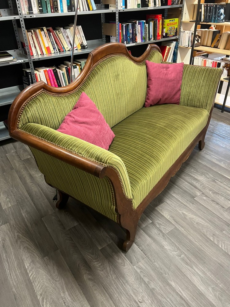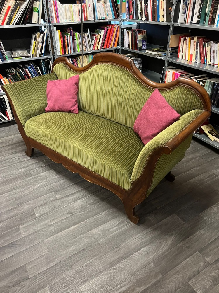 Canapé Louis Phillipe XIX tapissé d'un tissu vert olive et de clous décoratifs.