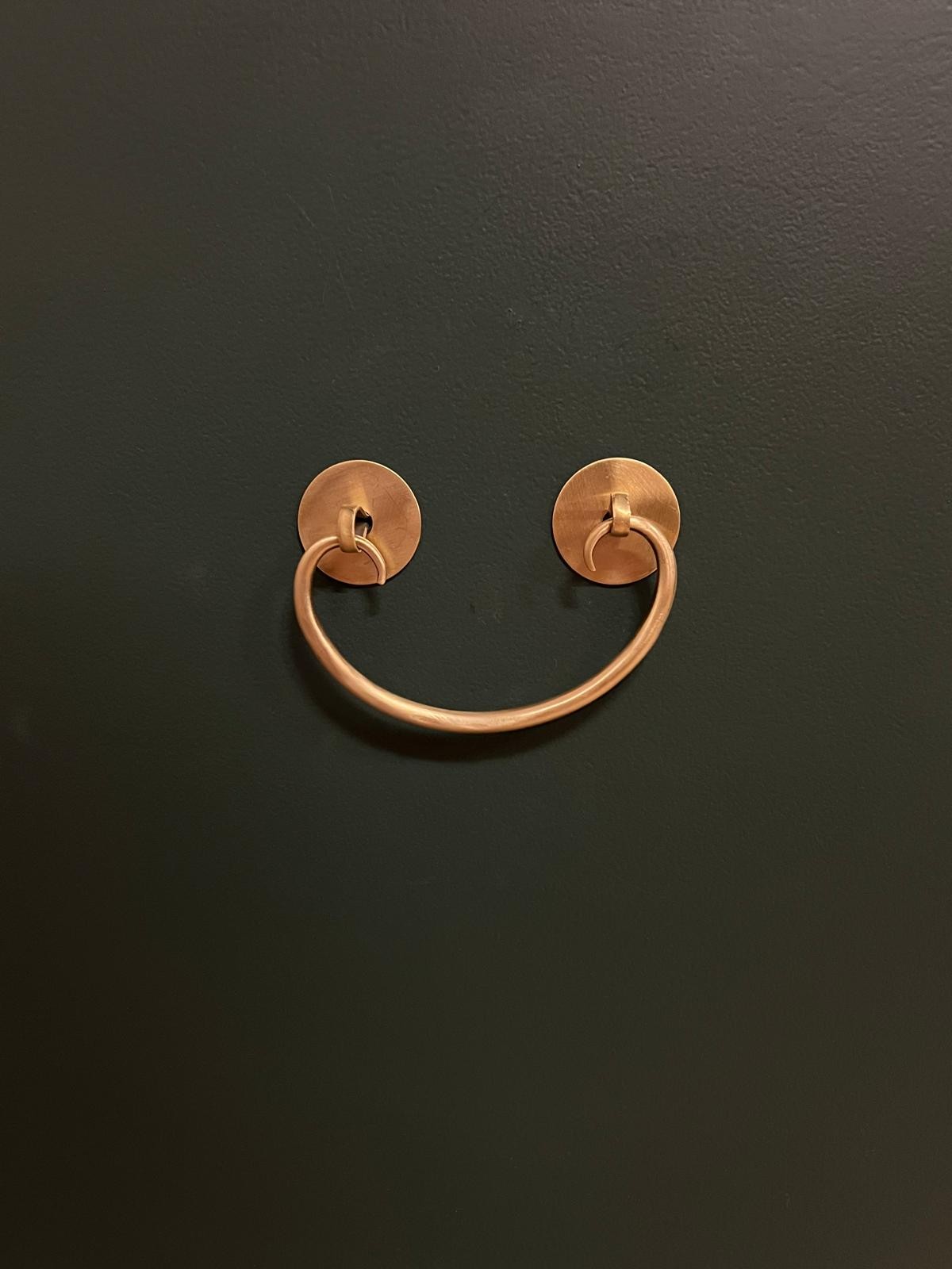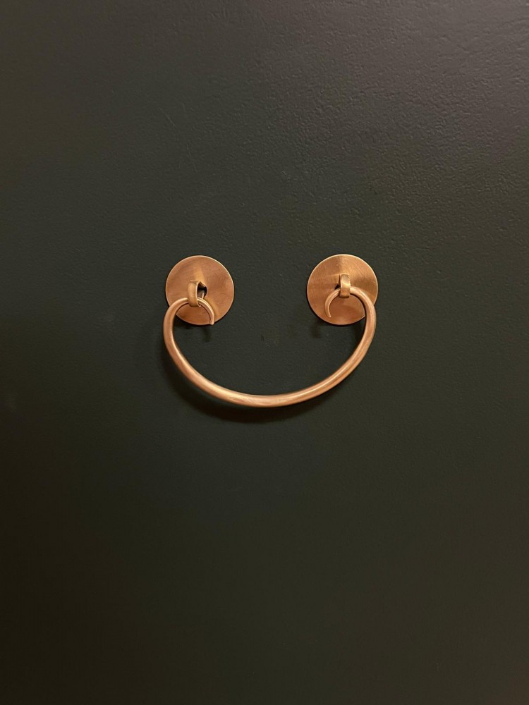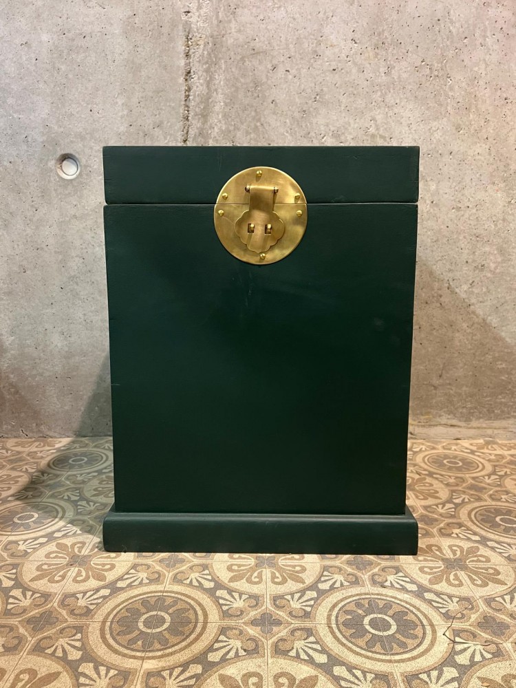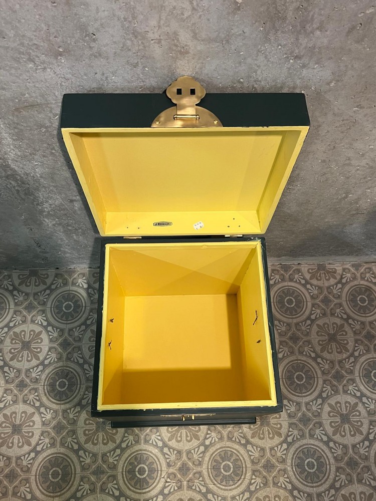 Coffret en bois peint en vert mousse, intérieur jaune. Fermoir en laiton.