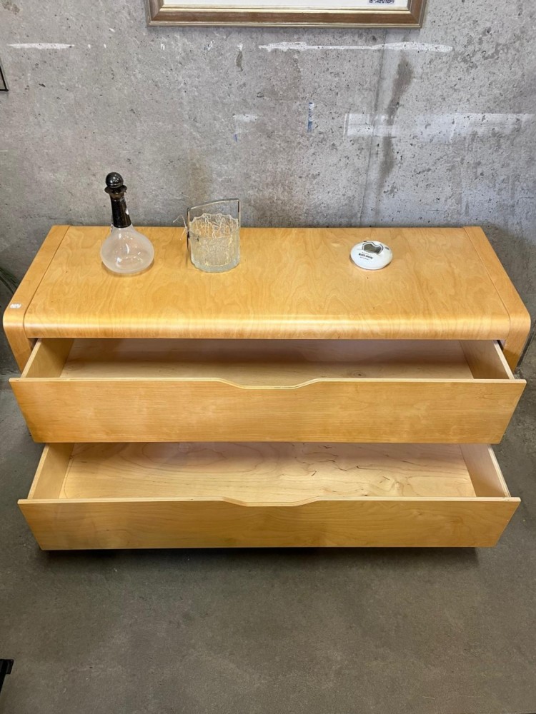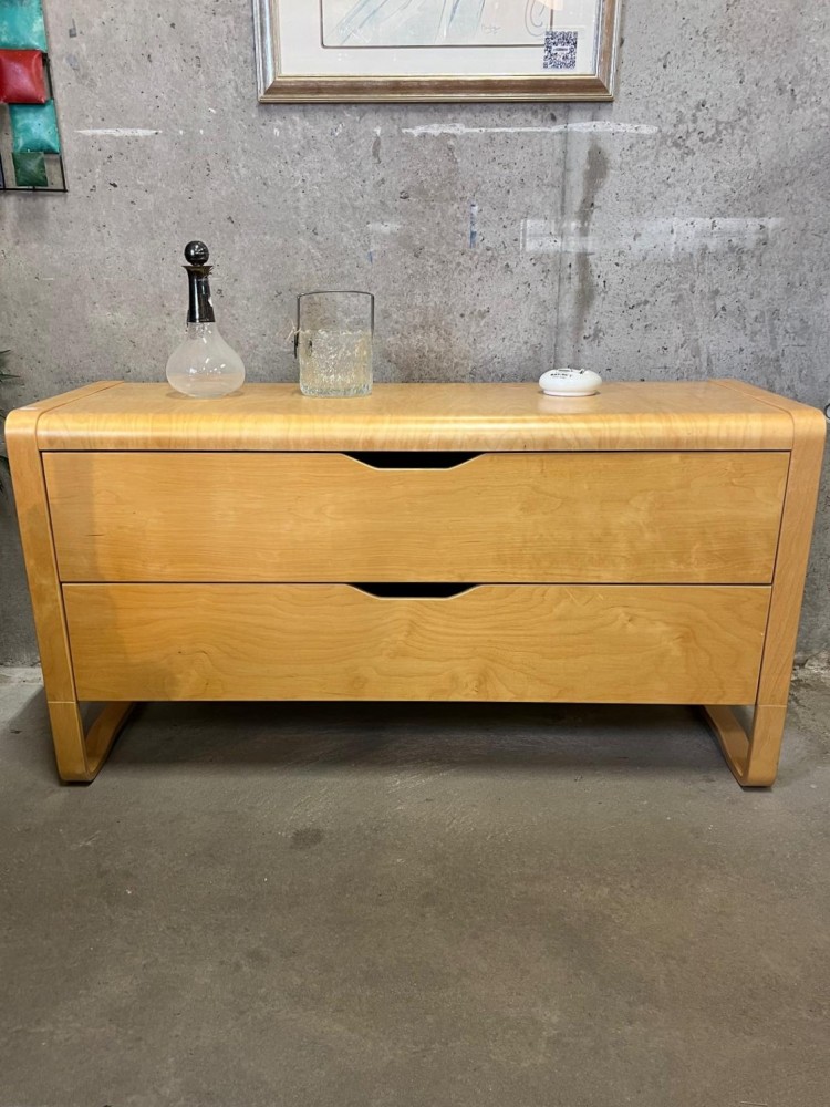 Buffet vintage en bouleau contreplaqué avec deux tiroirs à poignées intégrées. Modèle Anes, design d’Ehlen Johansson.