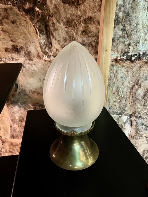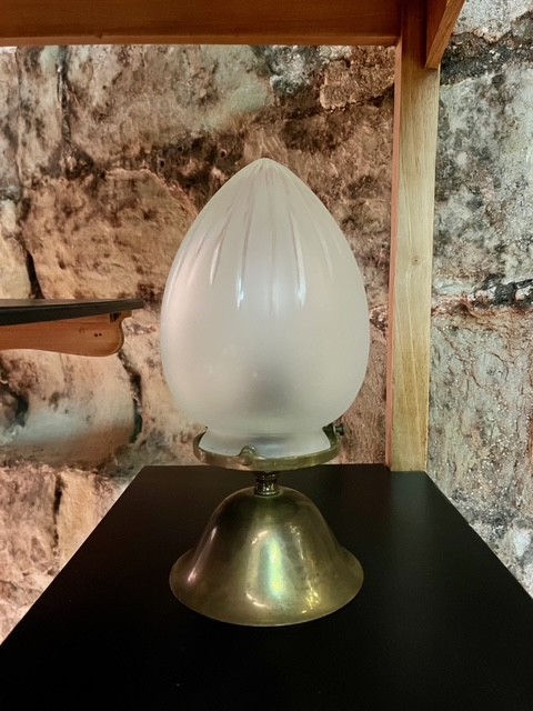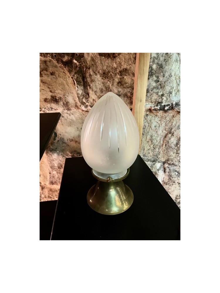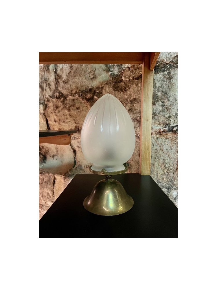 Plafonnier ancien, style Art Deco, abat-jour en verre translucide, pied en laiton. Douille E14.