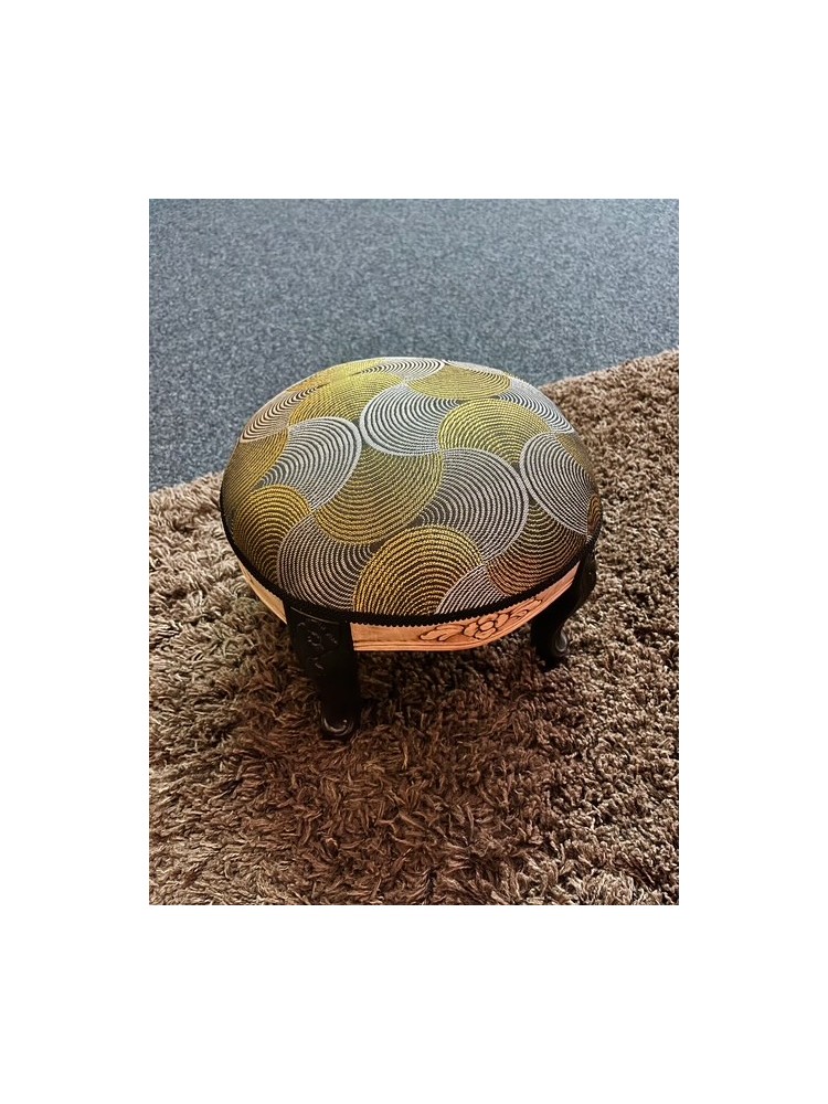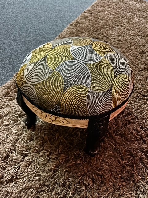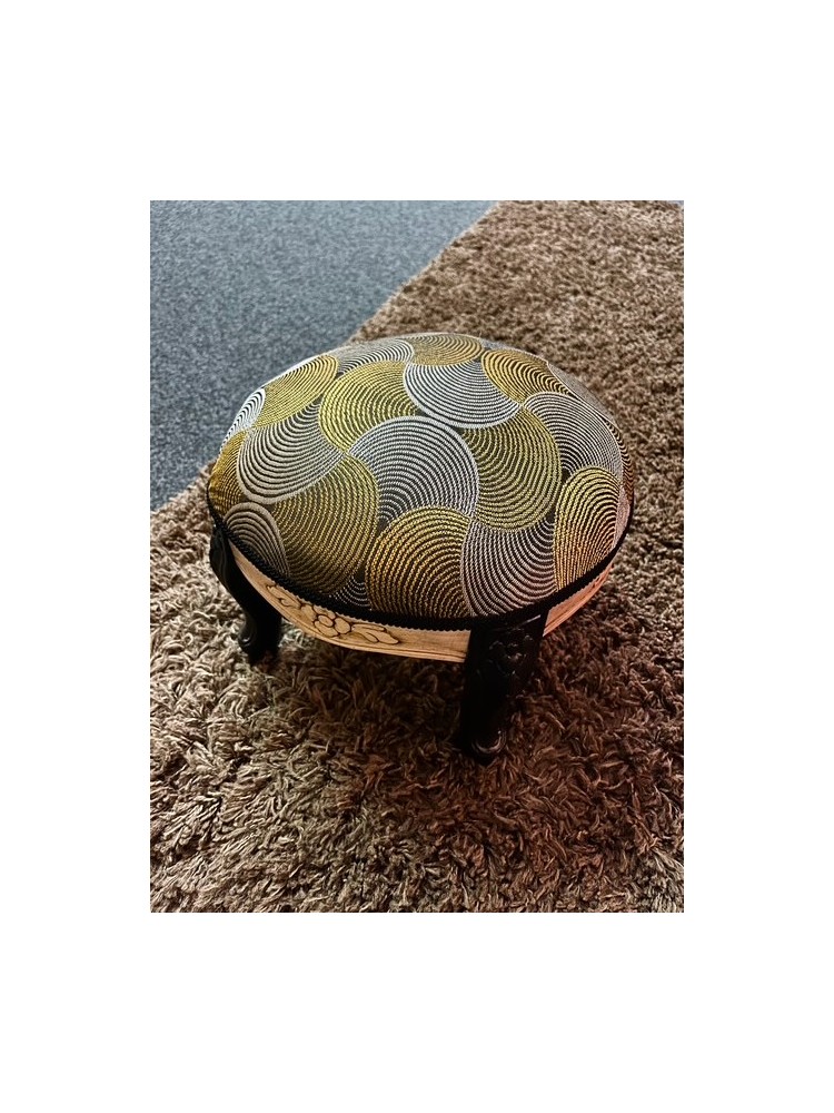 Pouf relooké, bois massif naturel et peint en noir, tapisserie à motifs courbes blancs, noir et dorés.
