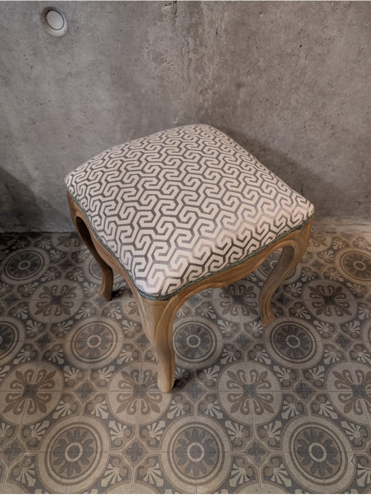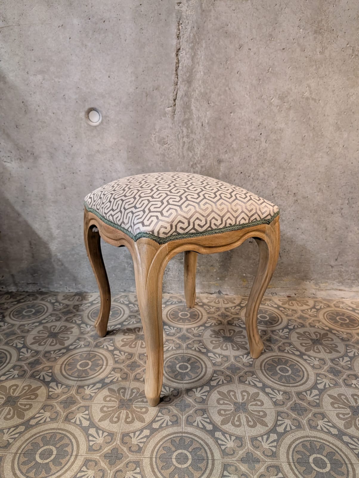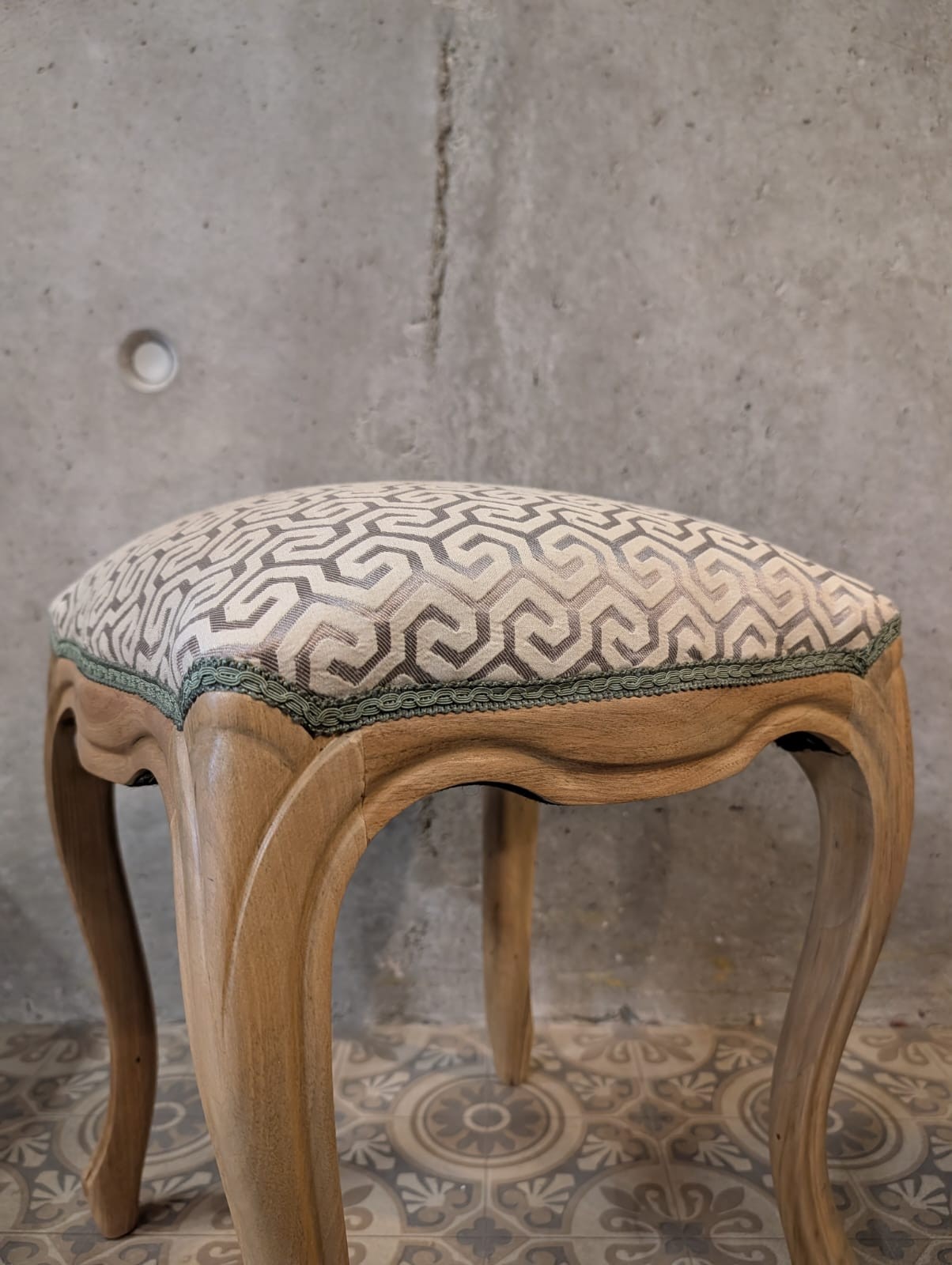 Tabouret style Louis XV, relooké dans notre atelier, pieds galbés en bois naturel, tissu blanc cassé à motifs géométriques, galon vert olive.